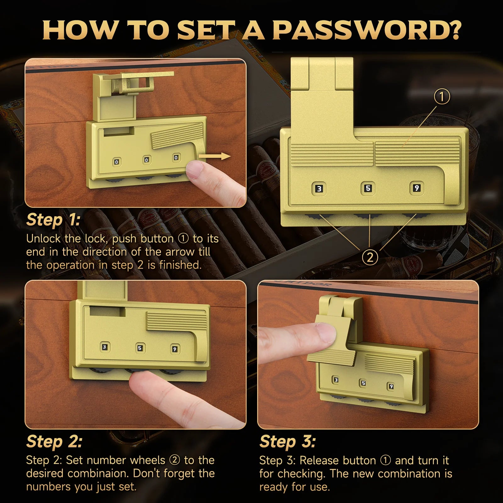 Mit digitalem Hygrometer, Befeuchter, Trennwänden und einer praktischen Zubehörschublade haben Sie alles, was Sie für die optimale Lagerung brauchen. Das Kombinationsschloss schützt Ihre Sammlung zuverlässig.